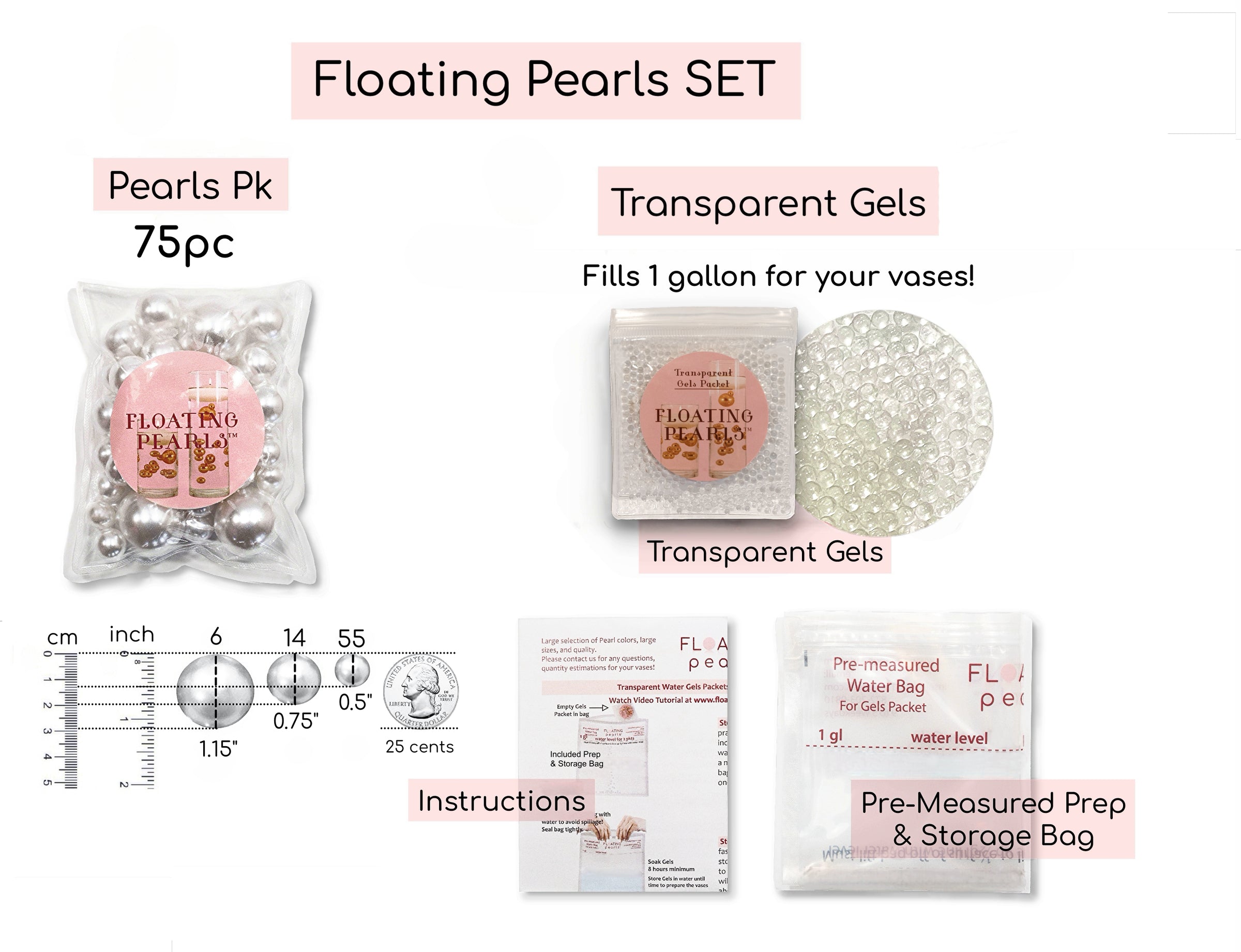 • The Transparent Water Gels are polymers that look like tiny beads. They expand in water and become fully transparent after 8 hours; they will look like water but more dense to hold the Pearls & Gems in place as if they are floating. It can be stored in water for several weeks before your event. The Floating Pearls, Gems, and Fairy Lights can be prepared in the vases up to 7 days in advance, stay fresh and afloat for months, transportable, removable, storable, and reusable! We suggest you practice on a vase and then store the Gels in water, so nothing is wasted : )  Please see Video Tutorial